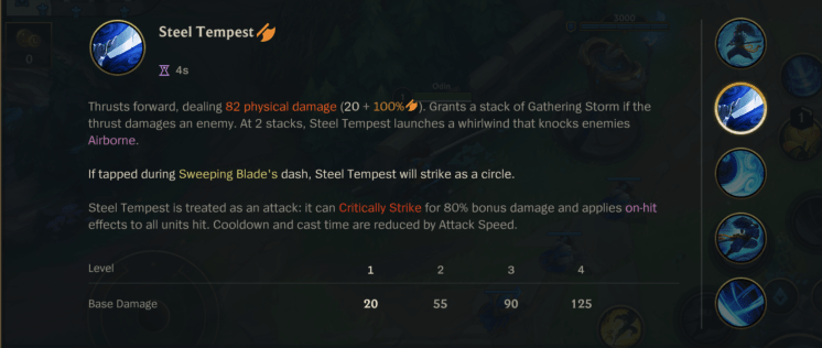 Yasuo thrusts his sword forward, damaging all enemies in a line. If Steel Tempest hits an enemy, Yasuo gains a stack of Gathering Storm. When Yasuo has two stacks of Gathering Storm, Steel Tempest becomes a sweeping tornado that knocks up enemies hit. In simpler terms, Yasuo’s Q changes depending on the number of stacks it has. Q1 and Q2 are basically the same while Q3 can be released as a tornado projectile or a circular tornado when combined with his E. The stacks will be shown on top of the Q as 1 or 2.