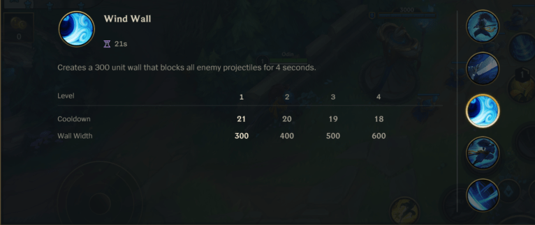 Yasuo creates a wall of wind that blocks all enemy projectiles, including basic attacks and abilities. Wind Wall lasts for a short duration and has a long cooldown. You can wind wall all projectiles including minions, Dragons, and Baron (but not turrets).