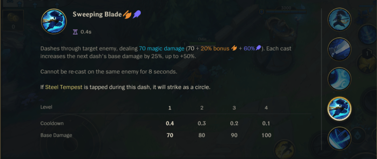 Yasuo dashes through a target enemy, dealing damage and marking them. Yasuo cannot recast Sweeping Blade on a marked enemy so it is important to keep track of which enemy is marked. The marker will show as a circular timer under the target. When combining E and Q it becomes a circular attack that damages the enemy around Yasuo. When doing the EQ combo with 2 charges of gathering storm it will knock up enemies around him we will call this move circular tornado. You can also E and delay your Q to throw a tornado after your dash instead of doing an EQ combo.