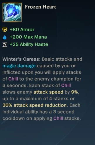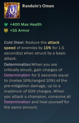 2 items reduce attack speed and they both build from the same item. Wardens mail which builds to Randuin and frozen heart. This is good against Vayne, Yasuo, Yone, and more… basically auto-attack speed-based characters.